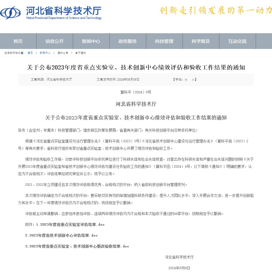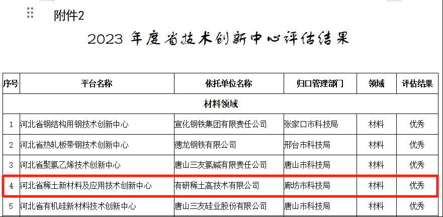 日前,河北省科技厅发布了《关于公布2023年度省重点实验室、技术创新中心绩效评估与验收工作结果的通知》,有研稀土高技术有限公司和有研稀土新材料股份有限公司联合共建的“河北省稀土新材料及应用技术创新中心”(以下简称“中心”)在2023年度绩效评估中被评为“优秀”。